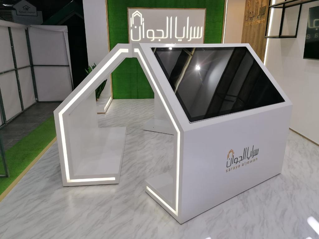 تصميم جناح سرايا الجوان بأسلوب عصري يجمع بين الإضاءة الحديثة والعناصر الطبيعية، ليعكس فخامة المشاريع العقارية ويمنح الزوار تجربة راقية ومريحة.