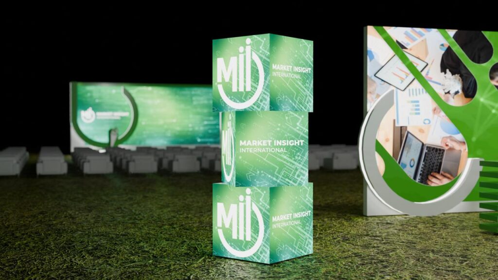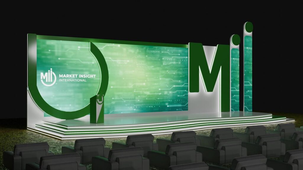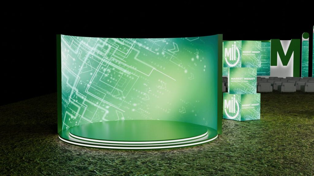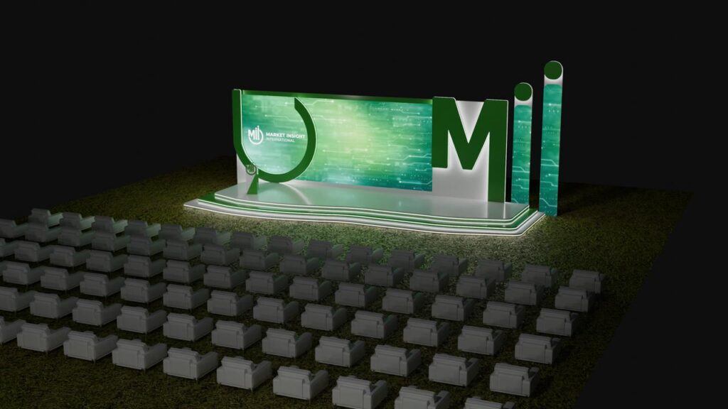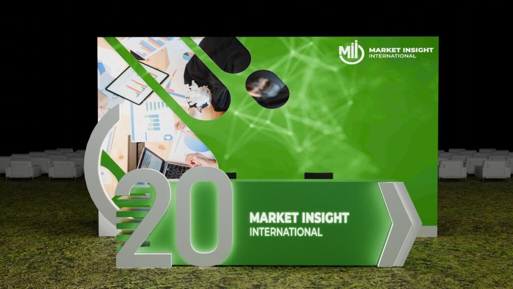 تصميم متكامل لفعالية Market Insight International (Mii) بأسلوب عصري يعكس هوية الشركة التقنية، باستخدام ألوان خضراء وحركة ضوئية تفاعلية تبرز الرقم 20 احتفالًا بمرور 20 عامًا من الابتكار والتحليل السوقي.