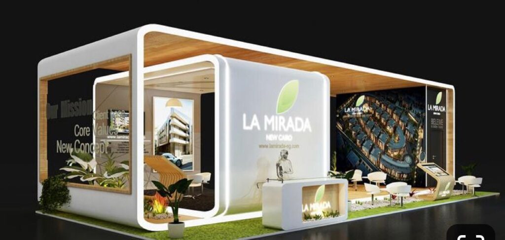 تصميم وتنفيذ بوث شركة LA MIRADA بأسلوب عصري يجمع بين الأناقة والبساطة، مع استخدام إضاءة داخلية وخامات طبيعية تعكس هوية المشروع وتبرز تفاصيله المعمارية.